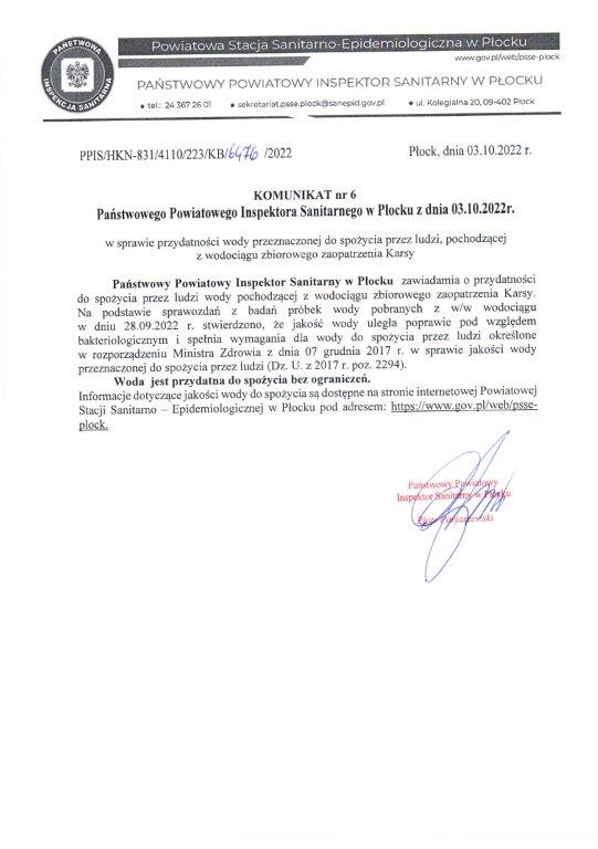 Pokaż Państwowy Powiatowy Inspektor Sanitarny w Płocku informuje, że woda przeznaczona do spożycia przez ludzi z wodociągu zbiorowego zaopatrzenia Karsy NADAJE SIĘ DO SPOŻYCIA.
